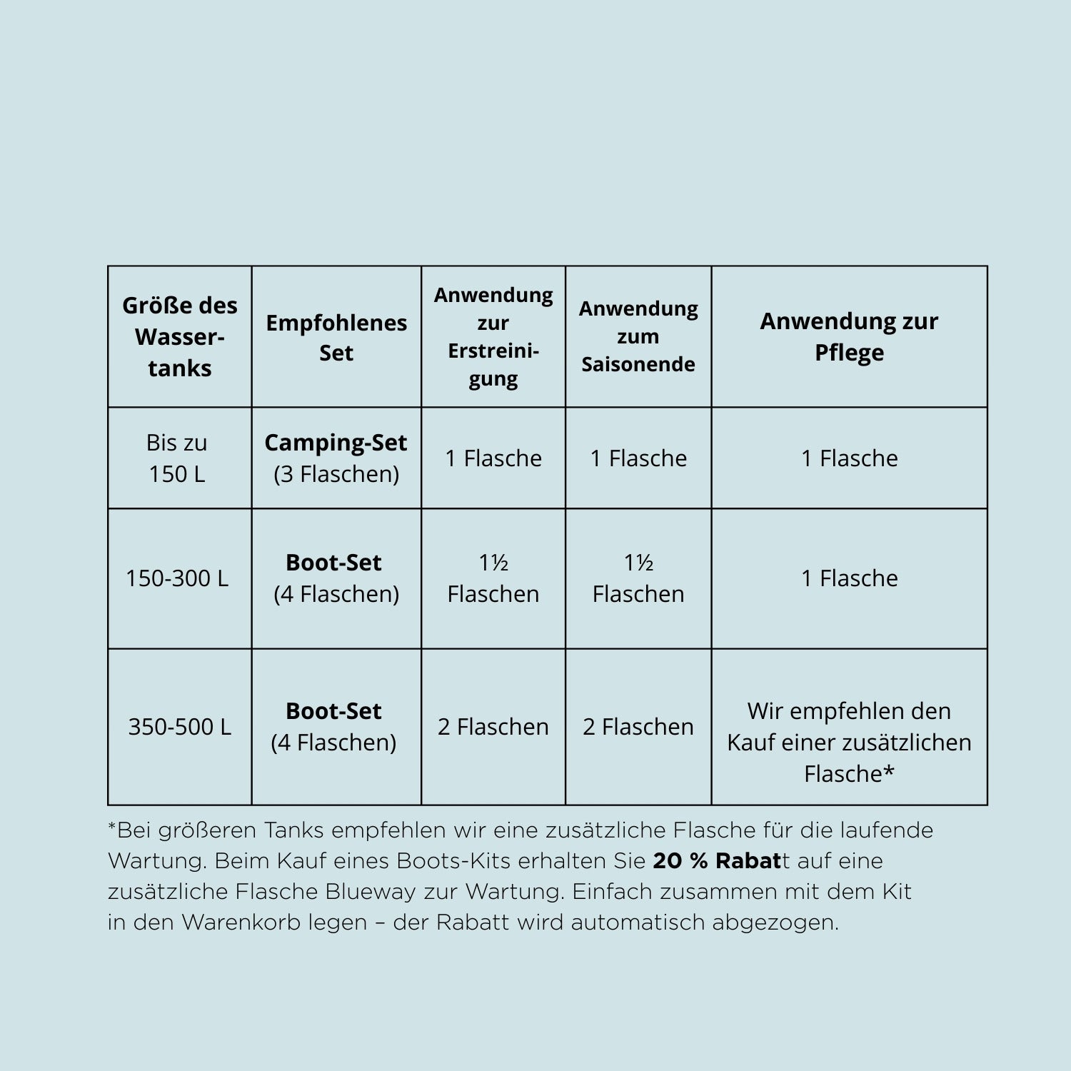 Wir empfehlen jedoch immer, die Dosierung in der Tabelle einzuhalten, um die beste Wirkung zu erzielen und Tank sowie Wassersystem zu schonen. Wenn Sie einen Aluminiumtank haben, ist die korrekte Dosierung besonders wichtig.
